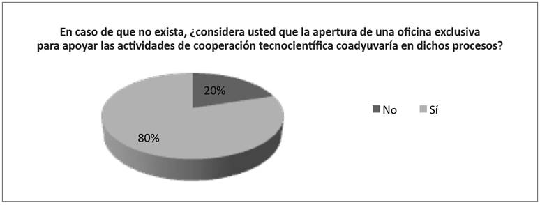 Asimismo, en la Figura 4 se puede observar que la mayoría de los participantes (80 %) considera que una oficina exclusiva para apoyar las actividades de cooperación tecnocientífica coadyuvaría en dichos procesos. Lo anterior concuerda con los resultados de López-Leyva (2002), en cuyo estudio los investigadores dieron opiniones favorables hacia la creación de organismos y mecanismos para promover la comercialización de la investigación. En particular, 68.5 % mencionó que deberían existir oficinas comercializadoras. A este respecto, como parte de sus conclusiones, Bajo cita: