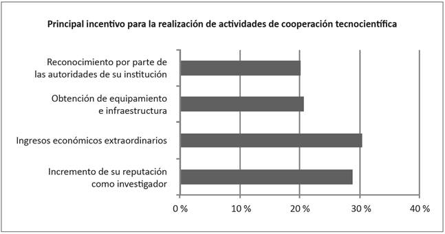 Otros factores específicos que identificaron los investigadores como parte de lo que los mueve a este tipo de cooperación son: la posibilidad de obtener mayores ingresos económicos -aunque las percepciones adicionales no se deriven de las acciones y actividades colaborativas per se, sino de los incentivos institucionales y organizacionales asociados a esas tareas-; la construcción personal de un capital reputacional; la posibilidad de participar en equipos de investigación inter y transdisciplinarios, así como la búsqueda y el logro de mayores apoyos para los proyectos de investigación aplicada y tecnológica. No obstante, los profesores-investigadores también reconocen que el exceso de carga laboral en sus respectivas IES puede imponer límites al desarrollo y a la consolidación de la cooperación tecnocientífica; asimismo, opinan que no se observa un fomento genuino de la cooperación por parte de las autoridades y funcionarios de las IES.
