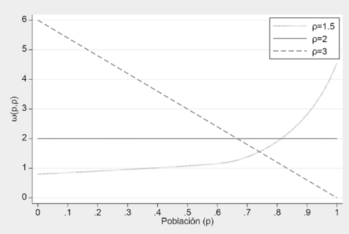Este valor del parámetro debe ser superior al valor de 1 en ω(p;ρ) para poder lograr positividad en cualquier parte de la distribución. Ello ha permitido introducir una familia de índices de Gini extendidos que sí captan los cambios operados por los impuestos (o transferencias) en un sistema fiscal, por lo que superan las limitantes que operan en todo enfoque de tipo local. Duclos y Araar (2006), de forma sencilla y sofisticada a la vez, nos ofrecen la manera gráfica de observar la forma distribucional de los pesos asignados de tipo ω(p;ρ) para este tipo ético de índices de S-Gini en la Figura 1, para valores de ρ iguales a 1.5, 2 y 3: