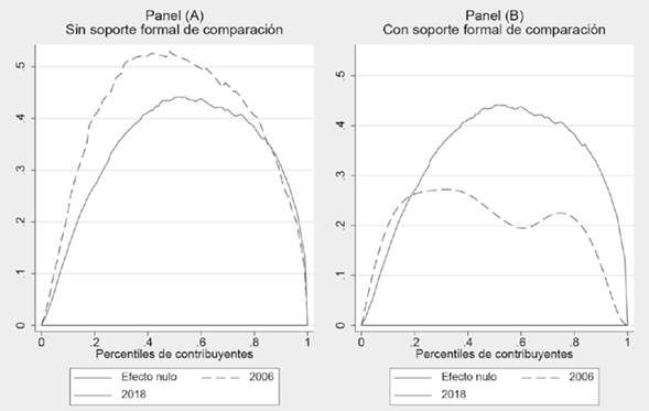 La Figura 3 muestra en el panel izquierdo la estimación sin considerar el soporte formal de comparación y en el panel B la correspondiente con el soporte. Es fácil observar cómo se comprueba que el sistema fiscal que prevalece a partir del 2018 sí logra contar con mayor nivel de progresividad, es decir, la relación de los pagos impositivos y la recepción de transferencias directas beneficia a los contribuyentes de menores recursos; sin embargo, cabe mencionar que la capacidad recaudatoria ha caído drásticamente, como ha sido registrado por el estudio de Huesca y Araar (2016).