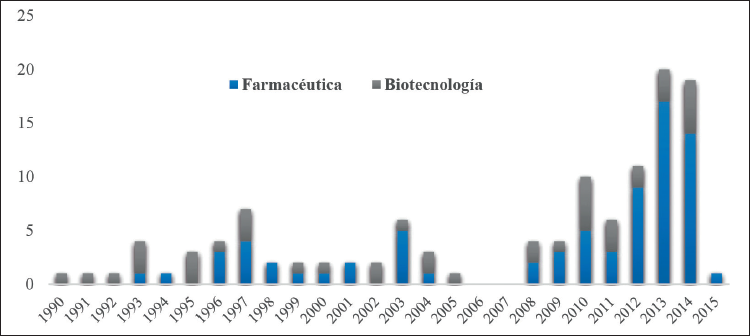 La industria biofarmacéutica de México se caracteriza por una actividad inventiva errática y marginal patentada en el Instituto Nacional de Propiedad Industrial (IMPI) y también en las oficinas internacionales de propiedad intelectual, como la USPTO. Frente a países industrializados e incluso emergentes como India y China mantiene una enorme brecha, asociada a un menguado gasto en investigación y desarrollo. Durante los años noventa y la primera década del nuevo milenio las patentes concedidas en la USPTO fueron prácticamente marginales. La actividad inventiva mayor se advierte entre 2012 y 2014, con una suma de 40 patentes concedidas, que equivale a 42.7 por ciento del total de las patentes de todo el periodo en estudio.