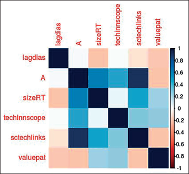 La capacidad de absorción del nuevo conocimiento del sector biofarmacéutico mexicano se mide por medio de una variable proxy que representa el rezago del tiempo con el que una patente solicitada de titulares mexicanos de las clases de farmacéutica y biotecnología cita las patentes previas, lagtimePatcit (Gay et al., 2008). Esta variable se mide como el número de días entre dos sucesos en el tiempo y es nuestra variable dependiente. Entre menor sea el rezago del tiempo en que se consulta la frontera del conocimiento para generar nuevas ideas se muestran mayores capacidades de absorción del conocimiento tecnológico; en este caso en el sector biofarmacéutico.
