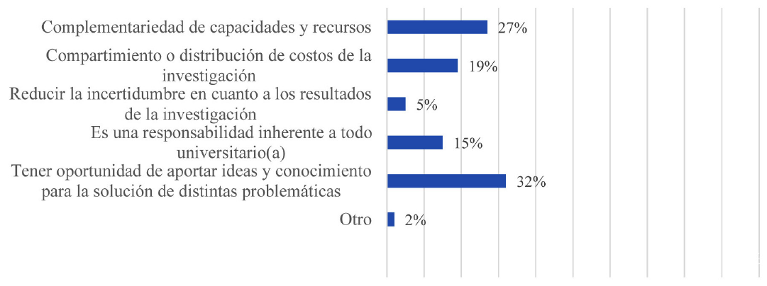 Por otro lado, en lo que respecta a los motivos que impulsan la CBC, en la lista que se muestra en la Gráfica 2, pueden distinguirse dos pretensiones: la primera tiene que ver con justificaciones teórico-prácticas de la CBC, que en este caso se sintetizan en la complementariedad de capacidades y recursos (que dentro del subconjunto es el principal motivo), en la distribución de los costos de financiamiento de la investigación, y la reducción de la incertidumbre. Estos aspectos son sintetizados en García-Galván (2017). En segundo lugar, se encuentran motivaciones que están más relacionadas con las convicciones y responsabilidades de los investigadores; en consecuencia, los investigadores señalan que la CBC con el gobierno es una responsabilidad de todo universitario, y lo más relevante es que se pondera este mecanismo como una oportunidad de aportar conocimientos y capacidades técnico-científicas para la solución de diversos y complejos problemas. Estos resultados coinciden con los presupuestos epistemológicos de Amaro (2023), Arocena y Sutz (2010, 2021), Arza (2010), Casas et al., 2022; De Sousa Santos (2017), García-Galván (2022), y García-Galván y Lindquist (2020), de que para que las universidades latinoamericanas ganen mayor legitimidad social tienen que participar más directamente en la resolución de sus problemas sociales y económicos más acuciantes.
