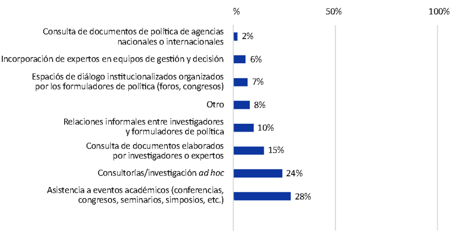 • Consulta de documentos elaborados por investigadores o expertos; • Asistencia a eventos académicos (conferencias, congresos, seminarios, simposios); • Incorporación de expertos en equipos de gestión y decisión; • Relaciones informales entre investigadores y formuladores de política; • Espacios de diálogo institucionalizados organizados por los formuladores de política (foros, congresos); • Consultorías / investigación ad hoc; • Consulta de documentos de política de agencias nacionales o internacionales; • Unidad interna de investigación (unidades híbridas de investigación vinculada hospedadas en las universidades). |
