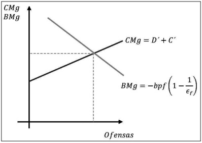 Cuando el número de delitos es inferior al nivel de equilibrio, el beneficio marginal (beneficio adicional que gana quien comete el delito) de cometer un delito es mayor que el costo marginal (lo que cuesta a la sociedad el delito desde la extracción de riqueza hasta los costos de la prevención y los gastos de impartición de justicia). Dado que el beneficio neto de cometer un delito adicional es positivo, se cometerán delitos hasta el punto donde el costo y beneficio marginales sean iguales.