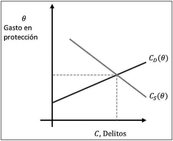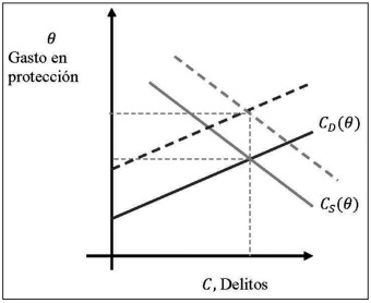 Para encontrar el efecto neto de la desigualdad sobre la incidencia delictiva, los autores parten del equilibrio inicial (CS (θ*) = CD (θ*)) siendo la oferta estrictamente decreciente respecto al gasto en protección (Cs,θ < 0, léase que la derivada de la oferta respecto al gasto en protección es negativa), mientras que la función de demanda es estrictamente creciente (CD,θ < 0, léase que la derivada de la demanda respecto al gasto en protección es positiva). Caracterizando al equilibrio como único, estable y único.
