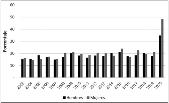 Gráfica 1 Evolución de la disposición al TT en EE.UU. por género. 2003-2020.