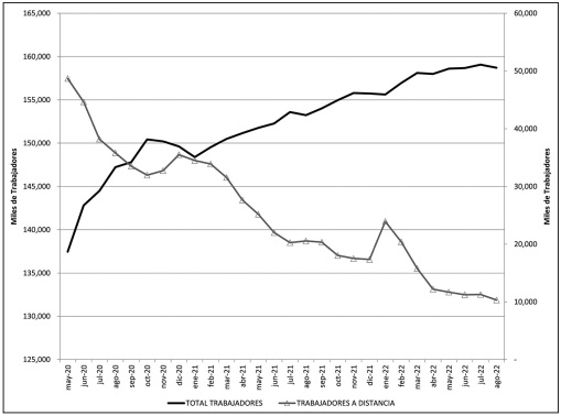 Aunque el TT ha propiciado que trabajadores relacionados con tareas y funciones cognitivas las ejecuten eficientemente, la pandemia forzó su casi inmediata adopción para los demás (Pabilonia y Vernon, 2022). No obstante, la realidad muestra que no todos pudieron transitar hacia esta opción porque no tenían ni los conocimientos ni los medios TIC para hacerlo (Tahlyan et al., 2022). Además de que muchos trabajadores tampoco tuvieron opción porque se vieron obligados a desempeñar sus funciones in situ ya sea porque tuvieron que permanecer al frente de la contingencia sanitaria para ayudar y asistir al resto de la población, o porque sus actividades son imposibles de ser realizadas de forma remota, como los choferes, los enfermeros y médicos, los bomberos y policías y los cocineros y conserjes entre otros (The Economist, 2021). Obviamente, este grupo de trabajadores nunca efectuaron actividades de TT y las estadísticas disponibles lo confirman (Garrote et al., 2021). Finalmente, los datos para EE.UU. (Galasso y Foucault, 2020) indican que, de mayo a octubre de 2020, el empleo total presentó una fuerte recuperación en medio de la pandemia, para estabilizarse pocos meses después, pero el número de trabajadores a distancia ha ido disminuyendo desde entonces. Esto se examinará más adelante.