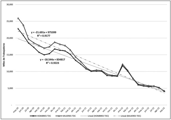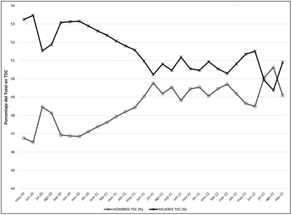 De la gráfica anterior se observa que las mujeres representaron la mayoría de los TT durante casi todos los 29 meses de análisis. La única excepción ocurre casi al final del periodo, en agosto de 2022, pero no se cuenta con información que permita explicar las causas del cambio.