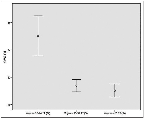 La figura anterior corrobora que el grupo de mujeres más jóvenes trabajaron en mayor proporción que el resto de sus compañeras de mayor edad. Los valores de las gráficas de barras de error muestran que los límites de los valores de significancia (95 por ciento) no se cruzan con los otros dos grupos, permitiendo demostrar que hubo una proporción más elevada de este grupo.