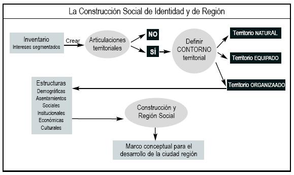 Se sabe que la identidad territorial es no sólo una cuestión ontológica sino también una cuestión construida mediante la combinación del pasado con el futuro; el pasado para unir y diferenciar a través del rescate de las tradiciones y el futuro para unir y diferenciar a través de un proyecto común. La participación, asunto de suyo difícil cuando se habla de una ciudad región de enorme masa poblacional (en el caso de BogotáCundinamarca más de ocho millones de personas) sólo puede materializarse mediante largos y sistemáticos procesos de conversaciones sociales profesionalmente estructuradas que convoquen a los agentes del desarrollo.32 La importancia del discurso (a la Habermas) es básica.