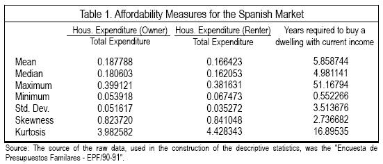 In terms of the role of the dwellings stock price, it is expected that its increment provokes the postponement of the demand for owned dwellings: since the time required raising the capital for the down payment increases proportionally to the price of the stock. Table 1 shows that on average the Spanish household needed almost 6 years of labour income to buy a house and almost 2 years to raise the capital for the down payment (supposing a down payment of 40% of the value of the housing stock). These figures do not seem very restrictive, being probably one of the reasons for the high ownership rate found on the Spanish Market.