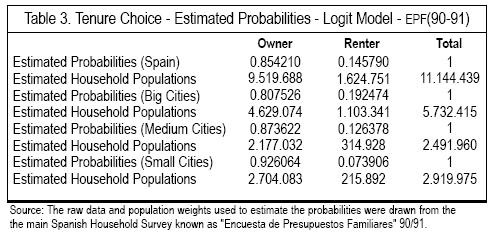 (Powner*Prenter). It is interesting to notice that these derivatives are bigger when the probabilities are closer to 0.5. In other terms, the derivative is larger when the doubt about the choice is greater. This fact produces important consequences to the Spanish case in which the estimated probabilities of being an owner, for the national data set, is very high, 85.42% in relation to the probability of being a renter 14.57%. This trend is aggravated when the size of the cities are smaller since the tenure choice division becomes more extreme as the city gets smaller, as can be seen in table 3. The probabilities have been measured using the method of sample enumeration in which the individual choice probabilities of each observation are averaged over decision makers. The weight represents the reciprocal of the probability that the decision maker was selected into the sample.