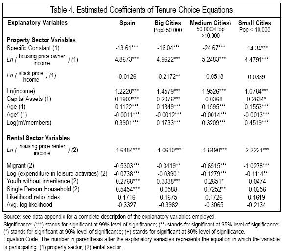 The work confirmed, in the Spanish case, the broad stylized facts about tenure choice: that the homeownership increases with income and age of the head of households. Also, it was found support to the importance of relative prices in the tenure choice decision as defended by the neoclassical theory. These results are robust on different data sets for the various city sizes studied in this work.
