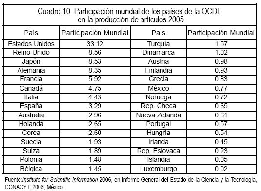 Aunque en el cuadro anterior se puede apreciar un crecimiento, éste no es tan acelerado como en los casos de India y Brasil, por compararlo con países en vías de desarrollo. Un cotejo de la participación mundial de varios países en ciencia y tecnología aparece en el cuadro 10.