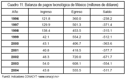 Pero si bien la capacidad científica del país ha aumentado, no se puede decir lo mismo de la capacidad tecnológica, pues la balanza de pagos tecnológica ha incrementado su balance negativo y pasó de 238.2 millones de dólares en 1996 a 511.7 en el 2004, aunque hubo años como el 2001 que alcanzó los 671.7 millones de dólares. Comparando la cifra de 1996 con la de 2004, se distingue que hubo un incremento en el déficit de la Balanza tecnológica de 115%. Esto se presenta en el cuadro 11.