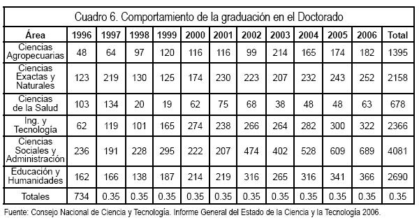 En el periodo de 1996 a 2006, espacio de 11 años, sólo se han graduado 13,368 doctores. Si dibujamos la tendencia en este periodo se traza una recta con un coeficiente de determinación de 0.936, lo que significa que no hubo un cambio de salto en este lapso. Un elemento positivo es que los graduados en ingeniería y tecnología, que en el año 1996 tuvieron un peso de 8.4% pasó a tener 17.18%. Pero una noticia no agradable es que gran parte del porcentaje lo perdió el área de ciencias exactas y naturales (ver cuadro 6).