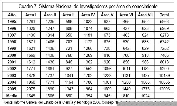 El comportamiento del Sistema Nacional de Investigación (SNI) se recoge en el cuadro 7 donde se analiza el peso de cada una de las áreas de conocimiento. El área I que corresponde a físico matemáticas y ciencias de la tierra sufrió una baja de 21.8% a 17.15%, en el periodo de 1995 a 2004. El área II, que corresponde a biología y química pasó de 21% a 15.6%; área III, medicina y ciencia de la salud de 10% a 11.10%; el área IV, humanidades y ciencias de la conducta de 17.4% a 16.2%; el área V de ciencias sociales y administrativas de 10.6% a 13.3%; área VI biotecnología y agropecuarias de 7.9% a 11.9%, por último, las ingenierías de 11% a 14.7%. El mayor crecimiento se contempla en las biotecnologías y las ingenierías. En la última fila del cuadro se obtienen las medias donde se ve que el área que ha tenido un mayor peso es la I, que fue la única cuya media rebasó 20% en todo el periodo, le siguió el área II con 18.42% y la más pequeña fue el área VI con cerca de 10%. Los datos que presentaron mayor dispersión fueron los del área VI. Un elemento positivo que se puede encontrar es que ninguna de las áreas presenta un índice negativo de crecimiento después del año 2000. Hubo un incremento de 15% en el año 2002 con respecto a 2001; de ahí en adelante continúa con su tendencia, de tal manera que si se obtiene un coeficiente de determinación para todos los datos alcanza 0.982, por lo que el ajuste es muy similar a una recta.