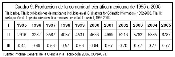 La producción de nuestros científicos ha aumentado en forma considerable como se aprecia en el cuadro 9, pero aún es reducido el crecimiento con respecto a otros países; sin embargo, a nivel de Latinoamérica sólo es superado por Brasil que tiene 1.42% del total de la producción científica mundial.