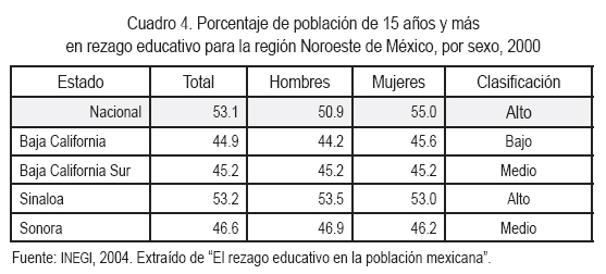 En todos los tamaños de población es mayor la proporción de mujeres que de hombres en rezago educativo. En los estados que conforman la región Noroeste de México, los rezagos educativos varían, por ejemplo, BCS es en donde se registra menos rezago para las mujeres 45.2%, mientras que en SIN se presenta el mayor, 53.0% (cuadro 4).