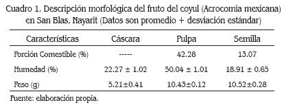 Como resultado del análisis fisicoquímico del fruto, que es típicamente brillante y liso de color verde olivo (figura I), el promedio del peso fue de 25 g (cuadro 1), la longitud axial (3.64 ± 0.23 cm) y radial (3.70 ± 0.20 cm) del fruto indica que la relación largo/ancho fue de 1.01, por lo que estos frutos tienden a ser globosos. La semilla del coyul presenta una cubierta exterior (endocarpo) de un grosor de 2.5 ± 0.5 mm y protege al interior (endospermo). La porción comestible del fruto es de más de 55%, a la pulpa le corresponde 42% (cuadro 1). El contenido de humedad del coyul (58% en la semilla, 24% en la pulpa y 10% en la cáscara. Ver cuadro 2) es menor que otros frutos de aceptación internacional y que se cultivan en la región como el mango y piña. Tienen valores superiores a 70% de humedad del fruto.