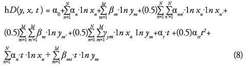 La propia selección de la forma funcional para representar un proceso productivo es otro procedimiento metodológico que debe realizarse con mucho cuidado pues incide directamente en los resultados obtenidos. Basados en Christensen, Jorgenson y Lau (1973), la forma funcional translog flexible fue seleccionada para representar a la tecnología de producción de camarón en cultivo (función de distancia de insumos), y es la siguiente: