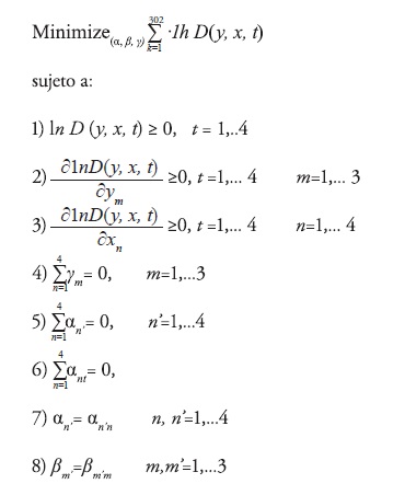 La resolución de la ecuación 8 en este trabajo se realizó mediante un método no paramétrico de determinación de eficiencia, llamado Método Envolvente de Datos (DEA por sus siglas en inglés: Data Envelopment Analysis) (Coelli, Rao y Battese 1998; Fare, Grosskopf y Knox, 1994), para lo cual se desarrolló un código en hoja de cálculo Excel. Es así que programación matemática es utilizada para estimar los parámetros de la función de distancia no estocástica mostrada en la ecuación (8). La técnica fue inicialmente utilizada por Aigner y Chu (1968) y radica en minimizar la suma de las desviaciones de los valores de la función, de la frontera desconocida que está siendo estimada (desviaciones de la unidad). Restricciones de desigualdad se incluyen para representar el tratamiendo asimétrico de los productos deseables y no deseables, de tal manera que las restricciones débiles de desigualdad para la primera derivada de la función de distancia son necesarias. El objetivo del problema es elegir el grupo de parámetros que minimizan la suma de las desviaciones de cero, de los valores logarítmicos de la función de distancia. Las condiciones de monotonicidad, homogeneidad y simetría son impuestas (Hailu y Veeman, 2000), para resolver el siguiente problema: