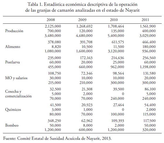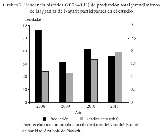 A través del Comité Estatal de Sanidad Acuícola e Inocuidad de Nayarit (Cesanay), se recopiló información primaria de insumos y productos de granjas comerciales de cultivo de camarón en el estado de Nayarit, en el periodo 2008-2011. La base de datos es heterogénea, con un total de 32 empresas provenientes de las Juntas Locales de Sanidad Acuícola (JLSA) de Rosamorada (20) y Tecuala (12), aportando información, desglosada por año de la siguiente manera: en 2008, 4 granjas; 2009, 26 granjas; 2010, 28 granjas y 2011, 10 granjas. Las gráficas 2 y 3 y la tabla 1 resumen la estadística descriptiva de operación de las granjas incluidas en el análisis. Algunos aspectos que resaltan son los siguientes: