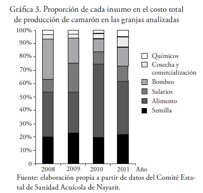Analizando conjuntamente eficiencia técnica y los porcentajes que cada insumo tuvo en los costos totales de operación en estos cuatro años (gráfica 3), se obtiene que en los años 2009 y 2010 es el alto costo del alimento lo que incide en una menor eficiencia técnica. Si bien pudiera haber elementos técnicos y de manejo de alimentación relacionados con este valor, ello refleja, principalmente, afectaciones (mortalidades) por enfermedades, especialmente cuando estas se presentan en organismos que llevan varias semanas ya en cultivo y hubo alimento suministrado que no incidió en producto cosechado.