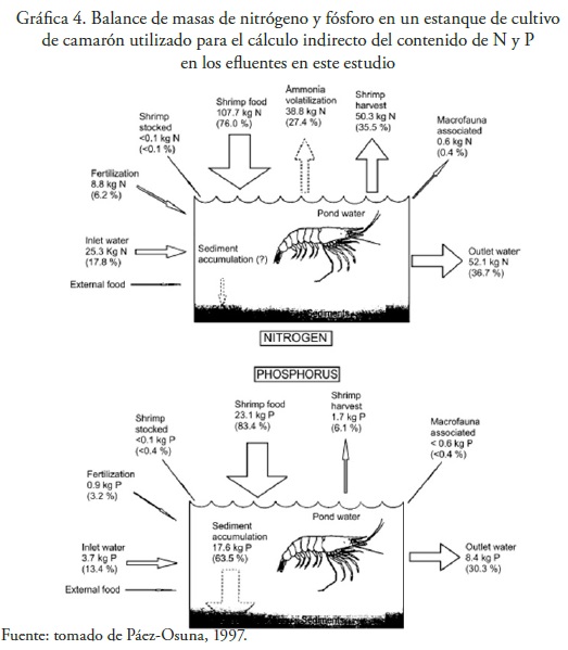 En el presente trabajo no hubo medición directa de estas descargas en los efluentes de las granjas. Sus valores se obtuvieron por un método indirecto que implica aplicar un balance de masas reportado en la bibliografía, en este caso se utilizó el reportado por Páez-Osuna et al. (1997) para cultivo de camarón en Sinaloa, mostrado en la gráfica 4. Para cada granja, estanque y ciclo de producción que se tuvo información, se calculó el total de nitrógeno y fósforo descargado en los efluentes y se insertó en la función producción 8.