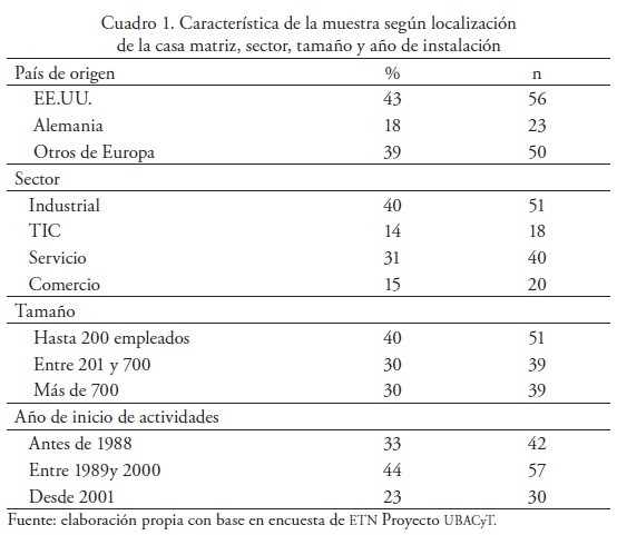 A partir de estos elementos, la muestra de empresas seleccionadas tuvo las características que se presentan en el cuadro 1. Al respecto, las filiales de EE.UU. representan 43% de la muestra,4 en tanto que el sector industrial es el de mayor relevancia. En este mismo orden, debe marcarse que fue dividido el sector servicios entre aquellas actividades pertenecientes al sector de Tecnologías de la Información y Comunicación (tic) y los servicios tradicionales, por tratarse el primero, de una actividad en expansión en los últimos años en Argentina, cuya particularidades laborales han sido señaladas en numerosos artículos académicos (Castells, 1997; Castillo, 2007; Montes, 2010) y que en este trabajo queremos analizar de forma comparativa a otros sectores. En relación al tamaño de las empresas, se tomó el número de empleados para su definición, así, se elaboraron tres categorías, cuadro 1.