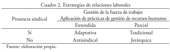 Tomando en consideración estas dimensiones para la construcción del indicador sobre gestión de la fuerza de trabajo se estableció que cuando dos o más de estas se encontraban presentes en la empresa, existía una aplicación extendida de las prácticas de recursos humanos, mientras que, la aplicación parcial hacia referencia a la implementación de una o ninguna de estas dimensiones. Por su parte, la presencia sindical se definió a partir de la representación sindical en la firma, específicamente a través de la existencia o no de delegados gremiales, tomando en consideración que en el caso de las empresas pueden tener presencia sindical a partir de tener diez empleados y que entre 50 y 100 empleados puede haber dos delegados. De esta manera quedaron constituidas cuatro estrategias de relaciones laborales (cuadro 2).