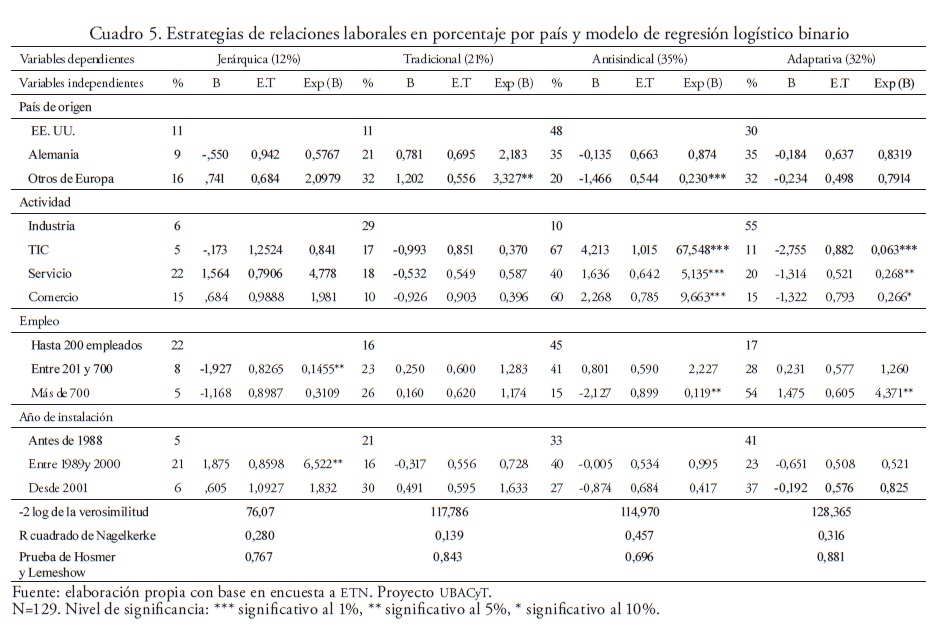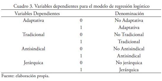 Las variables dependientes se encuentra conformada por las dimensiones surgidas de la tipología (Jerárquica, Adaptativa, Tradicional y Antisindical). De esta manera, se conforman cuatro variables dicotómicas, cada una de las cuales asume valor 0 cuando la empresa no adopta la estrategia considerada y 1 en caso contrario. Se realizaron, posteriormente, cuatro modelos, uno por cada una de las estrategias surgidas. Por su parte, como variables independientes se tomaron las vinculadas al país de origen de la ETN, el sector, la cantidad de empleados y el año de inicio de las actividades, las cuales se analizan por medio de variables Dummy, que hace necesario considerar una categoría de referencia para cada una de ellas.5