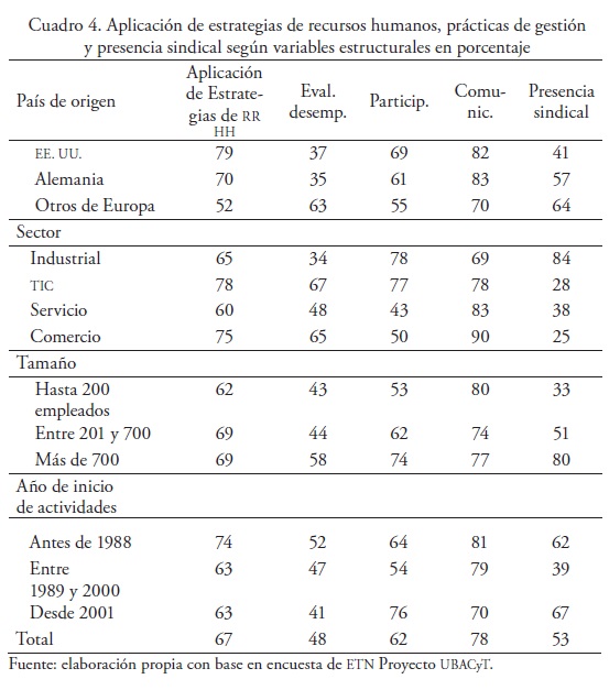 El cuadro 4 da cuenta del indicador de gestión de fuerza de trabajo, a partir de la aplicación de estrategias de recursos humanos, así como de cada una de las variables que componen dicho indicador y de la presencia sindical en la firma.