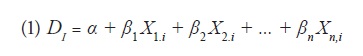 Donde, Di es la puntuación o clasificación discriminante (grupo de pertenencia) del individuo i ésimo; α es una constante; β es la ponderación de la variable j ésima (coeficiente asociado). El resultado de esta función será para un conjunto de variables independientes Xi.... Xn, para un valor D que discrimine al individuo en un grupo u otro. De modo que, el ADM dará una función menos que los subgrupos dados. Es decir, si la variable categórica (variable dependiente) tiene dos subgrupos, resultará una función discriminante.