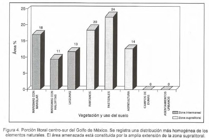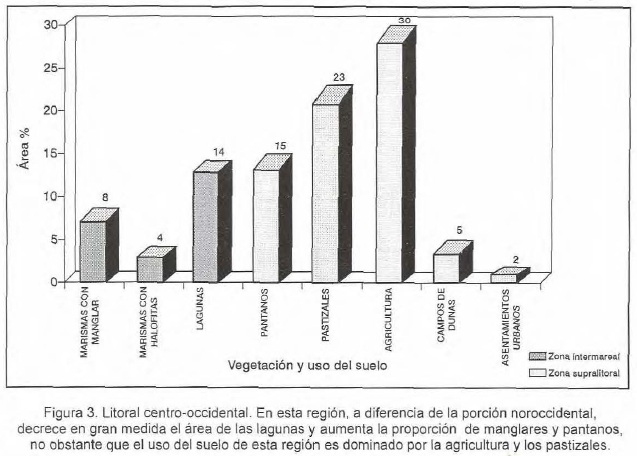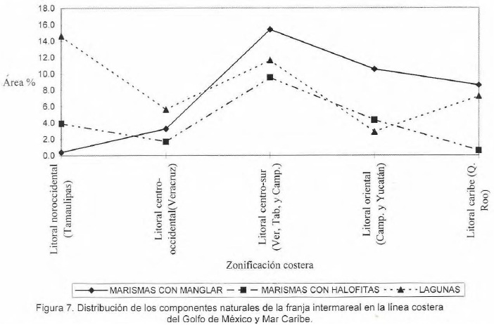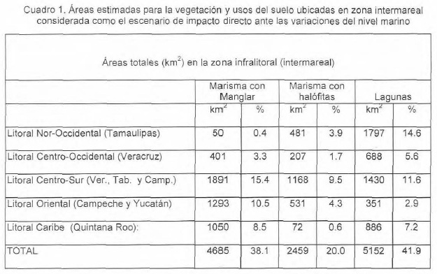 Sobresalen dos áreas en las cuales hay una clara manifestación de las variaciones presentes del nivel del mar. La primera se sitúa en el sector meridional de la laguna de Tamiahua y el río Tuxpan, que cubre más de la tercera parte de las marismas. Otra zona importante es la que corresponde a la porción meridional de Tampico. Sin embargo, el área realmente vulnerable se ubica en la región de la laguna de Alvarado, Veracruz. Aquí se presenta la superficie de inundación principal de este trecho del litoral, facilitado por la amplia bocana de Alvarado, así como por el sistema fluvial del Papaloapan, que reconoce esta depresión; es probable que el origen de ésta sea de carácter tectónico de hundimiento, como indican las mediciones geofísicas (Lozano, 1955). Estos sistemas reconocen a la región de la laguna de Alvarado que se extiende en un área próxima a los 700 km2, de los que 400 están cubiertos por manglares, siendo dicha área la más sobresaliente de este tramo correspondiente a la zona intermareal (Figura 3). De menor magnitud areal se presentan zonas con vegetación halófita (alrededor de 200 km2).