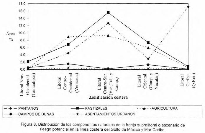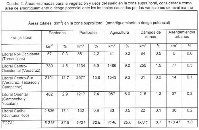 Otras áreas en riesgo potencial son las zonas agrícolas, mismas que se pueden ver afectadas por altas concentraciones salinas, ubicándose las áreas más extensas en el litoral centro-occidental y centro-sur. Asimismo, en la zona centro occidental y oriental, los campos de dunas adyacentes se encuentran en mayor proporción con respecto a toda la costa, amortiguando con ello el peligro de inundación. Otro uso del suelo de importancia lo constituyen los asentamientos urbanos sobre las zonas costeras, el de mayor afectación se localiza hacia el litoral centro-occidental, le siguen en orden de importancia el litoral orienta! y el Mar Caribe.