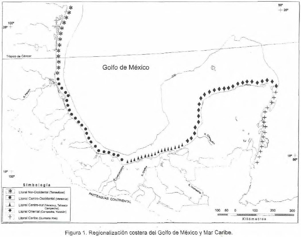 En primer lugar, un esquema de regionalización costera del Golfo ele México y Mar Caribe fundamentado en las características geomorfológicas, climáticas y en algunos aspectos hidrológicos.
