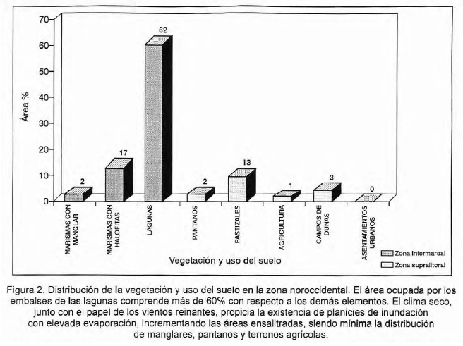 La zona intermareal se encuentra restringida debido a la poca amplitud de la marea. Sin embargo, el vasto desarrollo longitudinal de la costa, de más de 850 km, permite la presencia de más de 1 000 km2 de manglares. Superando este valor cabe distinguir a los pantanos con más de 2 800 km2 en la zona supralitoral o de amortiguamiento, extensión que indica la importancia del área potencial a inundación. Los otros usos del suelo (pastizales y agrícolas) son accesorios, pues cubren menos de 200 km2 (Figura 6).