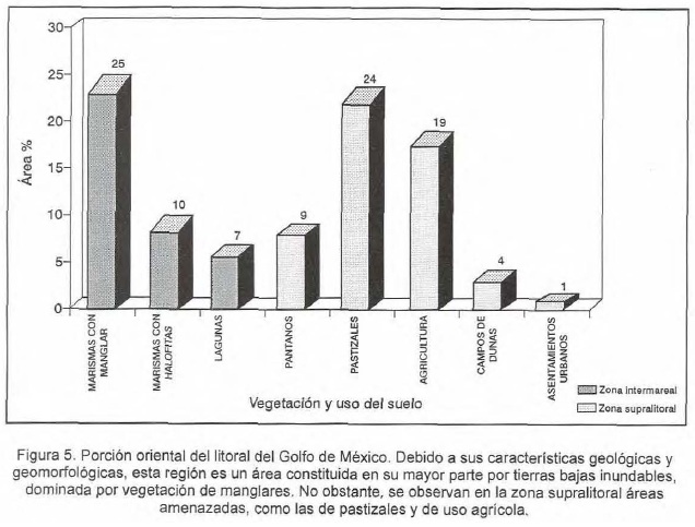 Asimismo, el Golfo de México provee importantes hábitats para una gran biodiversidad, que incluye pantanos costeros, pastos marinos, bosques de manglar, lagunas costeras y estuarios, bocas estuarinas que comunican sus aguas con el mar. Los pantanos del Golfo de México son críticos para las aves acuáticas y son utilizados intensivamente por aves migratorias (EPOMEX, 1994). La importancia de los humedales no siempre ha sido apreciada. Durante los últimos tres siglos, éstos han sido explotados como canales de drenaje y las marismas y ciénagas han sido desecadas para crear tierras destinadas al uso agrícola y al desarrollo urbano. Se estima que para el próximo siglo, los humedales y las tierras secas se convertirán en aguas abiertas (de mayor energía física) a lo largo de la zona costera (Titus, 1988).
