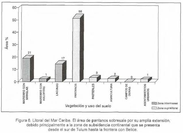 La zona supralitoral (Cuadro 2 y Figura 8) se distingue por un predominio de vegetación correspondiente a pantanos (37.5%) y pastizales (32.8%), es decir, ambos ocupan 70% del área total; 25% corresponde a campos agrícolas y un 5% restante se distribuye entre campos de dunas y asentamientos urbanos, Del total de pantanos, se ubican en el litoral del Mar Caribe, 17% y en el litoral centro sur, 12%, Los pastizales se concentran en un 15% también hacia el litoral centro-sur. Frecuentemente, estas comunidades están asociadas, ya que el tular y popal crecen en superficies pantanosas, o bien, en agua dulce permanentemente estancada, de 0.5 a 1.5 m de profundidad, en la planicie costera de Tabasco y al sur de Veracruz y Campeche. En una gran extensión de Tabasco y en algunas áreas adyacentes, el tular y el popal constituyen la vegetación más difundida y característica, ya que se trata de llanuras aluviales, prácticamente sin declive, atravesadas por caudalosos ríos, cuyos cauces se encuentran topográficamente por arriba de las llanuras de inundación. Estas áreas de pantano también tienen alto desarrollo hacia el litoral del Mar Caribe, donde cubren casi una quinta parte del área total con respecto a las demás comunidades de vegetación.