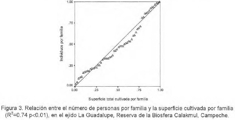 Al efectuar el mismo análisis, separando los cultivos mas importantes (maíz-chihua y chile), se encontró que el policultivo maíz-chihua es el que presenta una mayor asociación con el tamaño de la unidad familiar (r2=0.59 p<0.01); así, la superficie sembrada de este policultivo se comportó de la siguiente manera (total=189 ha, min.=1 ha, max =7 ha, x=3.3 ha, Ds=1.4, n=58). El monocultivo de chile jalapeño registre un bajo valor de asociación (r=0.29 p<0.01), lo que muestra que es un cultivo comercial, que no depende del tamaño de la unidad familiar, sino más bien, obedece a un estrato económico, ya que es un monocultivo que demanda una inversión mayor para su mantenimiento, debido al uso de agroquímicos y a la cantidad de mano de obra -jornales- requerida. La superficie de este monocultivo fluctuó de la siguiente forma (total=73.8 ha, min.=0.25 ha, max.=3 ha, x=1.3 ha, Ds=0.71, n=58).