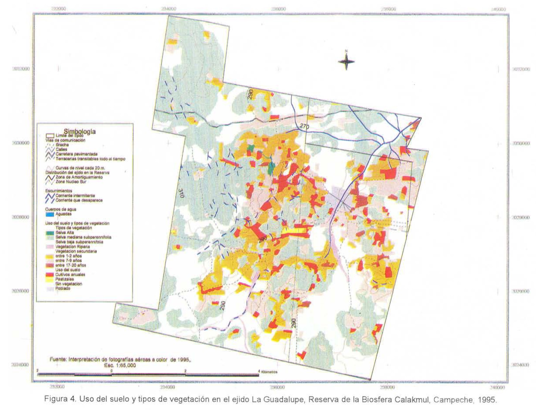 The transformation of the tropical forest in the La Guadalupe ejido (rural farming community) located at the Calakmul Biosphere's Reserve (CBR), was evaluated for the period between 1970 and 1995 using historical and geographical approaches as well as a Geographic Information System (GIS). The ejido comprised an area of 4 919 ha, 59% of which corresponds to the nuclear zone of the CBR, and 33% to the buffer zone. Three forest types, three types of secondary vegetation, riparian vegetation, and five-land use types were recognised. These were distributed along three landscape units: steep slopes, flat slopes, and lowlands. The largest surface area was occupied by medium semi-evergreen forest (1 846.5 ha), followed by low semi-evergreen forest (1 484.5 ha). A recent transformation (within 15 years) of the primary forest in the ejido was observed, with 1 244 ha of secondary vegetation, 617 ha of which was between one to two years old, and 588 ha between seven and nine years old. Subsistence agriculture was practiced on 225 ha in the ejido, with and beginning farming of the jalapeño pepper.