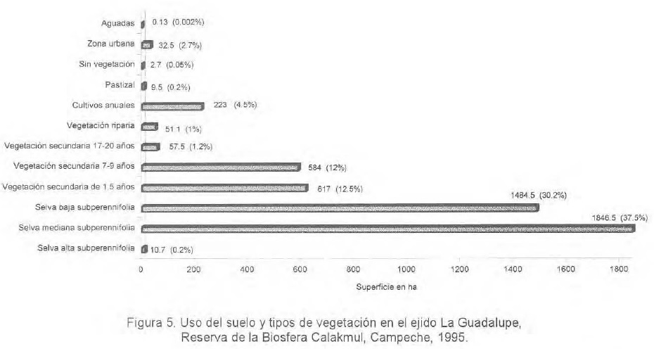 A través de un análisis geográfico-histórico y de la utilización de un sistema de información geográfica (S1G), se evaluó la transformación de las selvas en el ejido La Guadalupe ubicado en la Reserva de la Biosfera Calakmul (RBC), correspondiente al periodo 1970-1995. Se encontró que la superficie del ejido abarca 4 919 ha; de éstas, 59% se localiza en la zona núcleo sur y 32.5% en la zona de amortiguamiento. Se reconocieron tres tipos de selva, vegetación riparia y tres tipos de vegetación secundarla, así como cinco usos del suelo, que se distribuyen en tres unidades de paisaje; cañadas alias y planas y "bajial". La selva mediana subperennifolia ocupa la mayor extensión (1 846.5 ha) y le sigue la selva baja subperennifolia (1 484.5 ha). Se observó que la transformación de las selvas es reciente (menos de 15 años), ya que 1 244 ha corresponden a vegetación secundaria, de las cuales 617 tienen entre uno y dos años y 584 de siete a nueve años. En el ejido se practica una agricultura de subsistencia (225 ha) y un incipiente cultivo comercial de chile jalapeño.