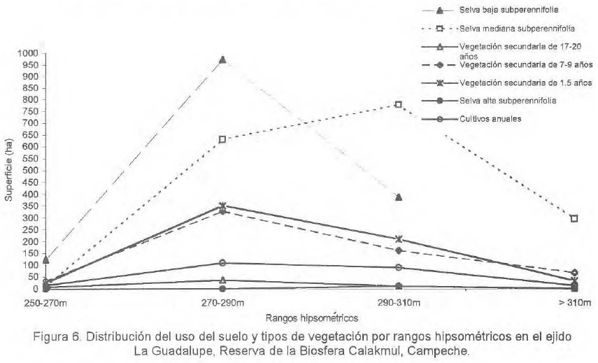 De esta forma, se aprecia que la transformación de la selva mediana se presenta en todos los niveles altimétricos; pero se acentúa en 822 ha en el rango de 270-290 m, que corresponde a la zona de la cañada plana. Lo anterior tiene una lógica productiva para los ejidatarios, ya que en esta zona se encuentran los suelos profundos, fértiles, con menor pendiente y, en consecuencia, con menor riesgo de erodabilidad.