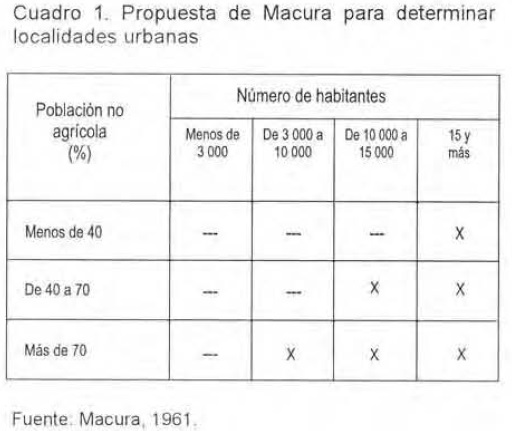 Se excluyen de la categoría de urbanas todas las localidades con menos de tres mil habitantes, sin importar cuál sea la población dedicada a actividades no agrícolas; en las localidades entre tres y diez mil habitantes sólo se consideran urbanas si más de un 70% de su población se dedica a actividades no agrícolas; en las localidades entre 10 mil y 15 mil habitantes se consideran urbanas si et porcentaje de población en actividades no agrícolas es superior a 40%; las localidades de 15 mil o más habitantes automáticamente se consideran urbanas sin hacer referencia a su estructura económica (Macura, 1961).