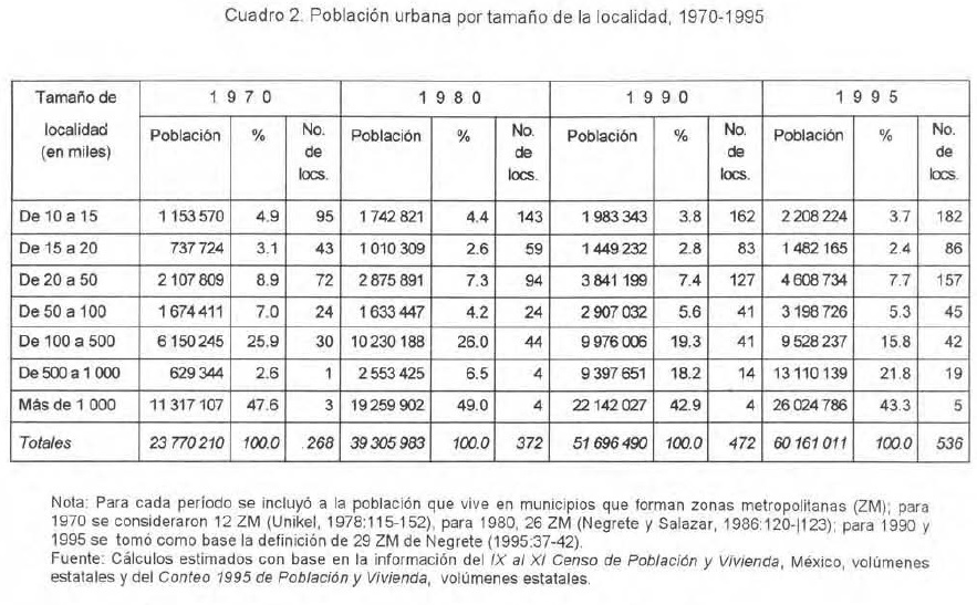 Es importante hacer notar que en este estudio, para analizar las características del intervalo de localidades mixtas urbanas, es decir, entre 10 mil y 15 mil habitantes, se incluyeron 162 localidades, o sea 93.7% del total registrado en el censo de población en 1990 (sólo se excluyeron las localidades que formaban parte de los municipios de las zonas metropolitanas del país).2