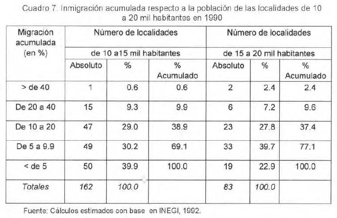 Con base en el supuesto de que el crecimiento total de la población en México equivale al crecimiento natural, debido al escaso impacto demográfico de la migración extranjera en el total nacional (Unikel, 1968:43), se puede suponer que en el período 1970-1995, debido a que el incremento medio anual del grupo de localidades entre 10 mil y 15 mil habitantes estuvo por arriba del crecimiento de la población total (Cuadro 6), el crecimiento de la población de esas localidades fue mayor que el crecimiento natural y, en consecuencia, se infiere que hubo un proceso migratorio rural-urbano.