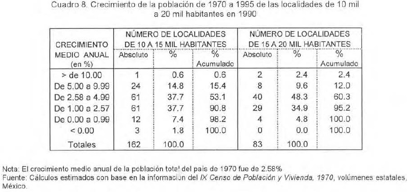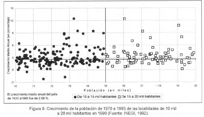 Si se analiza el crecimiento medio anual del grupo integrado por las localidades entre 10 mil y 15 mil habitantes, se observa que en el en el periodo 1970-1995 éste fue de 2.63%, resultando arriba del crecimiento medio anual de la población total del país que fue, para el mismo período, de 2.58%; este grupo destaca, además, porque su crecimiento estuvo por arriba del que presentó el grupo de localidades cuyo tamaño varió entre 50 mil y 100 mil habitantes y entre 100 mil y 500 mil, pero que fue ligeramente inferior al crecimiento de las localidades de 15 mil a 20 mil habitantes (2.83%).