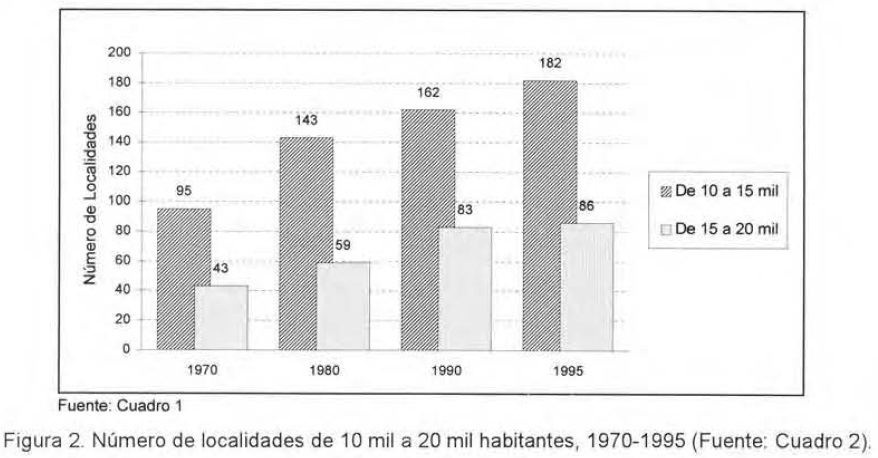 La población contenida en las localidades entre 10 mil y 15 mil habitantes es lo suficientemente importante en el período considerado (1970 a 1995), como para ser tomada en cuenta dentro de la población urbana del país. En este tamaño de localidades, en 1970 se registraron 1.1 millones de habitantes; para 1995 éstos aumentaron a 2.2 millones, es decir, duplicaron su valor en 25 años, aunque en valores relativos fue menor, bajó de 4.9 a 3.7% respecto a la población urbana total en 1995. Estos 2.2 millones representaban 3.7% de la población urbana total de México. En cuanto al número de localidades, al inicio del periodo, pasaron de 95, y a 182 a fines del mismo; es decir, casi se duplicaron; esto equivalía a 34% del total de las 536 localidades urbanas del país registradas en 1995 (Figuras 1 y 2: Cuadro 2).